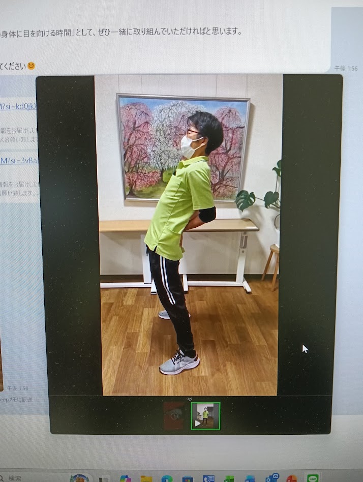 当社のグループラインに乗せて頂いた腰痛予防のためのストレッチの動画を写真にしました。